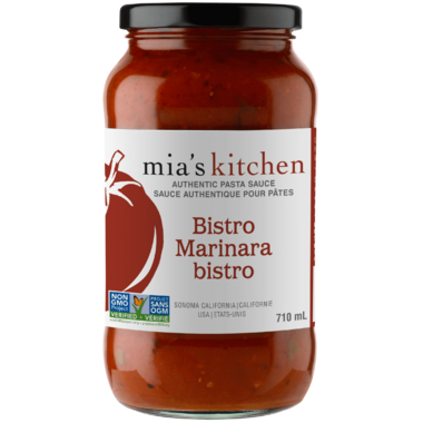 Mia's Kitchen Bistro Marinara is authentic pasta sauce made in Sonoma California and is non GMO.
