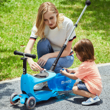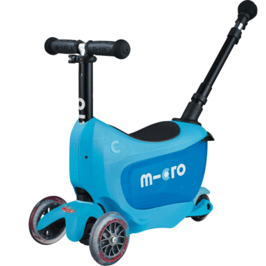 The removable telescopic pushbar is a great help when getting a tired child home from the park! The removable storage drawer means that favourite snacks and treasures are always close at hand while the original lean-to-steer mechanism promotes motor skills and balance. When the seat is no longer required, it can be easily removed and the Mini 2Go is transformed into a Mini MICRO Deluxe 3-wheeled kickboard with a black adjustable T-Bar handlebar.