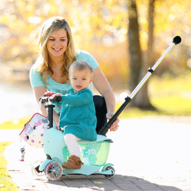 The removable telescopic pushbar is a great help when getting a tired child home from the park! The removable storage drawer means that favourite snacks and treasures are always close at hand while the original lean-to-steer mechanism promotes motor skills and balance. When the seat is no longer required, it can be easily removed and the Mini 2Go is transformed into a Mini MICRO Deluxe 3-wheeled kickboard with a black adjustable T-Bar handlebar.