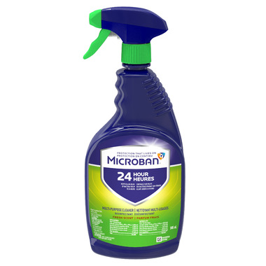 Microban 24 Hour Multi-Purpose Cleaning Spray keeps killing 99.9% of bacteria** for up to 24 Hours, even after multiple touches*, to support a clean and healthy home. This all-purpose sanitizing cleaner is great for every day messes and is suitable for use on all different types of non-food contact hard surfaces, like garbage cans, bathroom sinks, cabinets, etc.