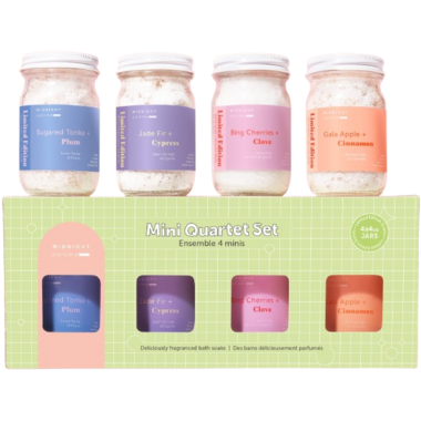 Discover the serenity of these Mini Quartet Sets four unique bath soaks in elegant 4oz glass jars. Crafted for blissful baths each scent invites you to mix and match creating personalized aromatic blends.