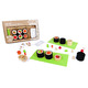 - Includes: 48 coloured wooden ingredients, 2 green felt placemats, 2 pairs of chopsticks, 33 cards with recipes and instructions