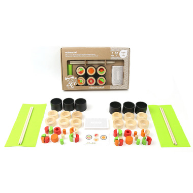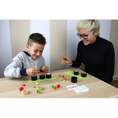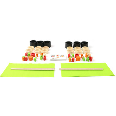 It is both a game of design and a test of skill and speed, with two Sushi Chefs competing. Each one has 24 coloured wooden ingredients to make mouthwatering Maki. One card from the recipe pack is turned over and each Sushi Chef starts preparing the required Maki, using only the chopsticks. The winner is the Sushi Chef who completes the recipe first!