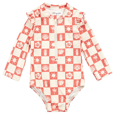 This quirky swim bodysuit features a pink Checkerboard print dotted with summery icons. With long sleeves, its perfect for girls who never seem to be able to stay out of the water. Its made from recycled nylon with elastane for a stretchy fit and has a zip down the front to make dressing easier. Finished with a frilly trim on the shoulders and built-in UPF50+, the swimsuit is great for little girls who need extra protection from salt and sand without compromising on fun and style.