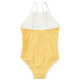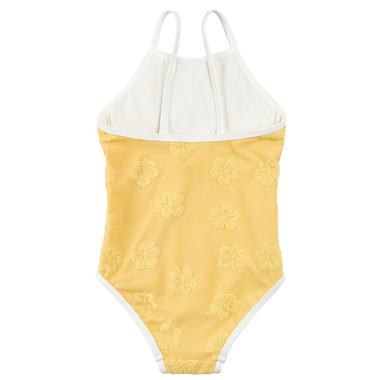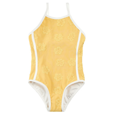 With white hems and spaghetti straps, this summery swim bodysuit has a sporty style and is made with a textured towel material. Perfect for wearing to the beach or pool, shell be a walking ray of sunshine in the mellow yellow piece with subtle floral print. With built-in UPF50+ sun protection, the swimsuit is comfortable and protective.