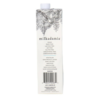Ingredients: Macadamia Base (Filtered Water, Macadamias), Calcium Phosphate, Pea Protein, Natural Flavors, Sunflower Lecithin, Locust Bean Gum, Sea Salt, Gellan Gum, Vitamin A Acetate, Riboflavin (B2), Vitamin D2, Vitamin B12, Zinc Gluconate.
