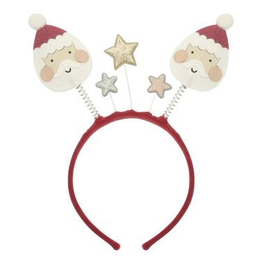 Burgundy velvet fabric wrapped alice band adorned with three central glitter fabric stars plus two sturdy springs topped with fabric crafted jolly Santa faces complete with glitter hats topped with tiny pom poms