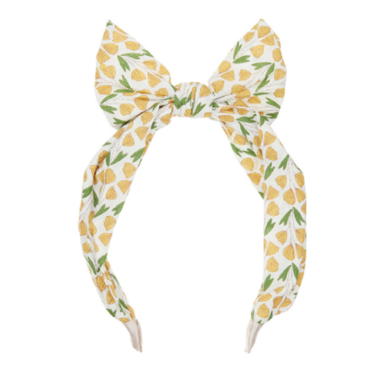 - Tulip printed fabric covered band with wired knotted bow and ribbon wrapped ends