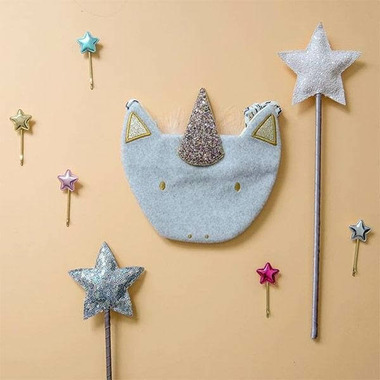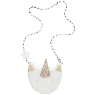 Sparkle wherever you go with this magical unicorn bag! Made from the softest pale grey felt, this unicorn has a gold hand embroidered face and a fabulous glittery horn. The long cross body strap is made from navy and white bungee cord and has a lovely holographic star detail. A perfect gift for a birthday or special occasion. Strap drop is length 48cm and has a magnetic fastening.