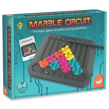 Mindware Marble Circuit is a multi-directional marble maze with 64 puzzling challenges! Choose a card to see your puzzle and place the multi-directional tiles on the board. Release the steel marbles to see if you land your targets. If you’re off base, move the tiles until your marble circuits deliver a picture-perfect landing! It’s logic, strategy and a brain game all in one!