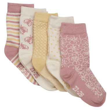 Fun and feminine 5-pack of patterned socks in soft pink tones. Features a variety of playful designs: stripes, dots, zebra, and more. Perfect for adding a cheerful touch to everyday outfits. OEKO-TEX STANDARD 100 certified; soft, safe, and comfortable for growing feet.