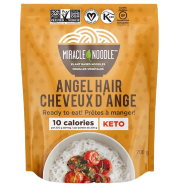 These plant based Miracle Noodle Ready to Eat Angel Hair Style Noodles are recipe ready and only 10 calories per 200g serving.