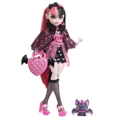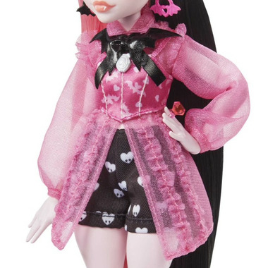 School is back in session, and the Monster High ghouls are showing up in scream-tastic style! Draculauraٙ doll struts down the Monster High hallways in a fang-tastic fashion featuring heart-print shorts and a vampy corset blouse with sheer sleeves. Her freaky-fabulous, vampire-inspired look is complete with sheer, ruffled stockings, pink platform shoes, and a headband and sunglasses with batty details. Take Draculauraٙ doll's look to the next level with a scary-chic cape and accessories. And inspire spooktacular storytelling with her creepy-cute pet bat, Count Fabulous!