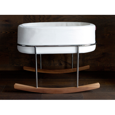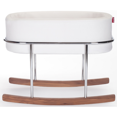 Monte's Rockwell Bassinet is synonymous with ultimate modern luxury; it is the perfect combination of beautiful materials and a soothing rock for your little one. Its streamlined chrome stand with solid walnut rocking feet is beautifully contrasted to the soft upholstered basket that can be removed and transported to different rooms in your home (or the Grandparents' home!). When you are finished with the bassinet, the basket alone makes an excellent spot to store all your baby's new stuffies! Rock your sweet little one to sleep in Monte's Rockwell Bassinet.