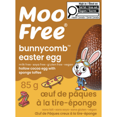 Moo Free Bunnycomb Easter Egg is a hollow cocoa egg with sponge toffee.