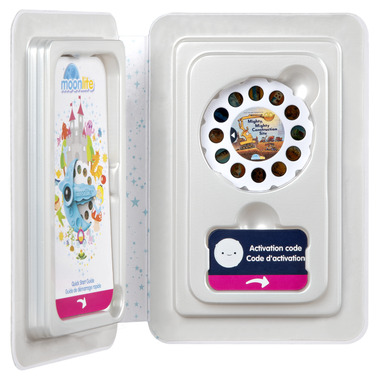 The award-winning Moonlite Storybook Projector (not included) for your smartphone makes reading even more special. Slide in the Story Reel and use the free app to read along to beautiful projected illustrations and create a truly immersive reading experience with the in-app sound effects!