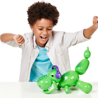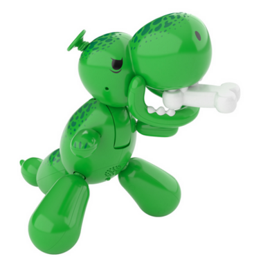 Meet Squeakee Dino! He's a stompin', chompin' Balloon Dinosaur! Totally interactive with 70 plus sounds and reactions, he loves being pet and tickled as well as playing games with you. Play Tug Of War with his Bone Squeaker and Chicken with him. Roar at him and he'll roar back. Attach his headphones and see him dance! Ages 5+