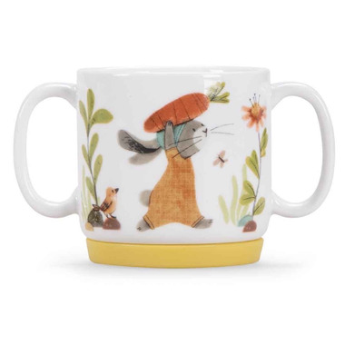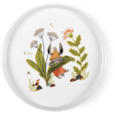 Porcelain dish set with adorable illustrations, for eating like a grown-up. Comprises a bowl, a cup with handles and a plate with a removable silicone non-slip base so it sticks to smooth surfaces without sliding off!