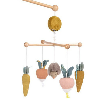 Musical mobile in soft colours for stimulating baby's sight and hearing, gently sending them off to sleep. A little hedgehog dances on a wooden structure amongst the vegetables in the garden carrots and radishes, before drifting away to the land of nod.
