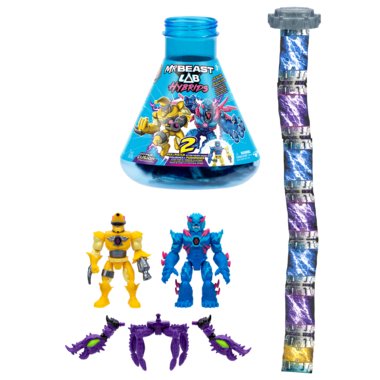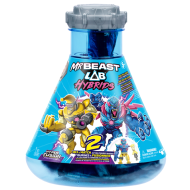For the first time ever, kids can step into Mr. Beast Lab to create the ultimate beast! With Mr. Beast Lab Hybrids, the power of fusion lies is in their hands mixing and matching millions of combinations to build the ultimate Mr. Beast Action Figure! The first step begins with the Mr. Beast Lab vessel twist and crack open the lid to reveal a strip of sealed foil bags. Rip them open to uncover individual beast parts, to create 2 epic action figures.