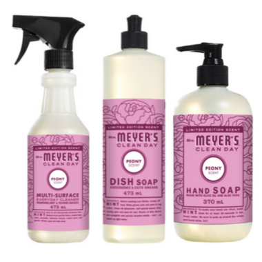 Enjoy the spring scent of peonies with this Mrs. Meyer's Clean Day Peony Bundle. Believe it or not, Mrs. Meyer is a real person! ​Mrs. Meyer's Clean Day philosophy is to make straightforward, honest cleaners that smell good and work like the dickens on dirt. All of their cleaning products are made with natural essential oils and are packaged in recyclable materials.