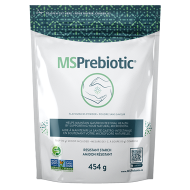 MSPrebiotic is a Prebiotic Resistant Starch extracted from Canadian potatoes. It is clinically proven to feed the good bacteria in the gut microbiome and crowd out pathogenic bacteria. MSPrebiotic balances the microbiome which it turn improves digestion and supports regularity helping with such issues as constipation, diarrhea, IBS or any-thing in-between. It is a fine white flavourless powder with 7g of insoluble fibre per scoop and can easily mix into liquids and soft foods.
