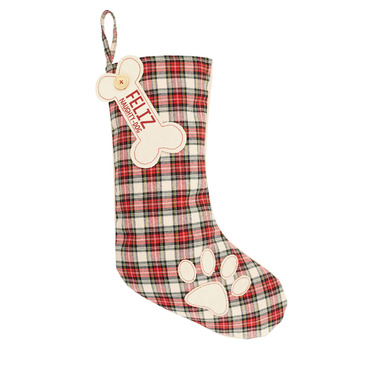 Make sure you fur baby has their stocking hung by the chimney this Holiday. This faux linen tartan stockings features a canvas paw print appliqué and "Feliz Naughty-Dog" removable dog bone shaped canvas tag with wood button detail.