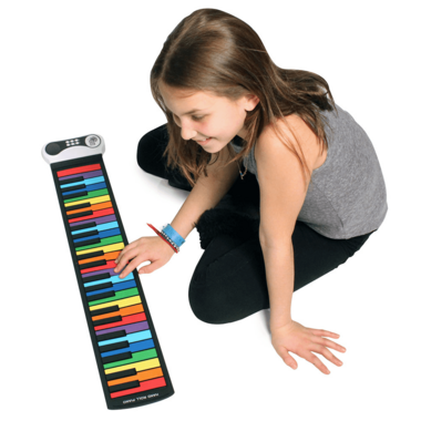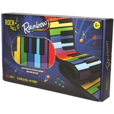 Rock And Roll It Rainbow Piano is flexible, portable and affordable. A new colourful "twist" on their flexible, portable design. Ideal for aspiring new musicians just taking interest in piano. The silicone material allows the piano to roll up and travel in a backpack and runs off of USB or battery power. A wonderful teaching tool and includes a songbook for children just starting to play piano. Mukikim's Roll Up Rainbow Piano lets you rock out anywhere with realistic sounds and encourages musical creativity and fine motor skills. Ages 6+.