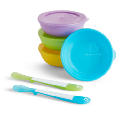 - Includes 4 bowls, 4 lids and 2 soft-tip, easy-grip spoons
