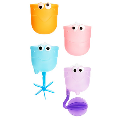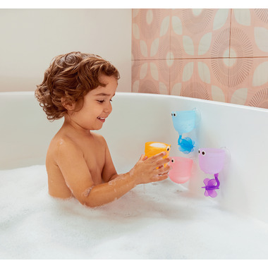 - Three distinct toys adhere to the bath tub wall using suction cups