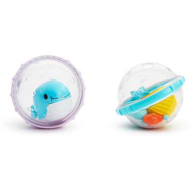 Does your little one love things that rattle, bobble, spin and shine? Then fun is sure to pop with Munchkin's Float and Play Bath Bubbles! Each floating bubble has a unique center toy that rattles, bobbles, shines and spins. They are sized for little hands to hold and help teach hand-eye coordination as babies learn to reach, grasp and shake the bubbles. Colorful rings move freely around the bubbles giving lots of textures and movement for your little one to explore. With these Float and Play Bubbles, bath time fun is about to bubble up! Each pack comes with 1 fun character and 1 whirly toy that spins or rattles.
