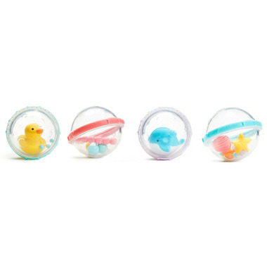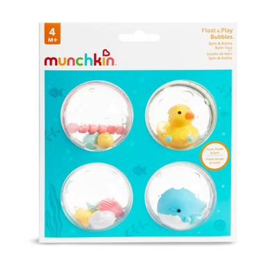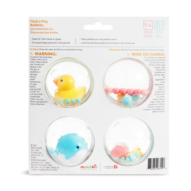 Does your little one love things that rattle, bobble, spin and shine? Then fun is sure to pop with munchkin's float and play bath bubbles. Each floating bubble has a unique center toy that rattles, bobbles, shines and spins. They are sized for little hands to hold and help teach hand eye coordination as babies learn to reach, grasp and shake the bubbles. Colourful rings move freely around the bubbles giving lots of textures and movement for your little one to explore. With these float and play bubbles, bath time fun is about to bubble up.
