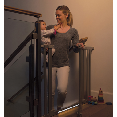 A night light for your new night life. The safety innovation award-winning gate combines beautiful style with an illuminating LED motion-activated light. Safe for use anywhere in the home, this pressure-mounted baby gate stands 29” tall and fits openings 30” to 54” wide.