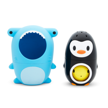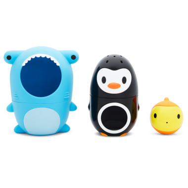 Its no secret that the right toys make for a better bath routine. Upgrade your toddlers tub collection with Sharky & Pals, a nesting bath toy that's triple the fun! The friendly shark, penguin and fish characters keep curious minds engaged while building essential hand-eye coordination skills. But theres more than meets the eye with this sweet trio. At first glance, it's a single toy shark, but surprise! There's a penguin and fishy "hiding" inside, playing peek-a-boo with your little one. Separate them to extend the ocean-inspired play -- the shark scoops, the penguin strains, and the fish squirts water. And when bath time is over, nest them back together for the easiest cleanup ever (just be sure to air dry before storing!). Your pint-sized seafarer will agree sometimes the simplest bath toys make the biggest, most surprising splash!