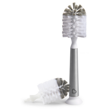 Durable and sturdy nylon bristles are tough on dirt, yet gentle on baby's bottles! Hard to reach corners are no match for the flexible brush neck, which bends and moves to get into every bottle with ease. Suction cup base allows you to simply pop it onto the counter top to keep it upright and away from germs. Soft rubber nipple brush is conveniently stored inside the handle for cleaning bottle nipples, pump parts, valves and other small bottle accessories. A brush with brawn and beauty guaranteed to "steel" your heart! When you need additional replacement brush heads, you just purchase them