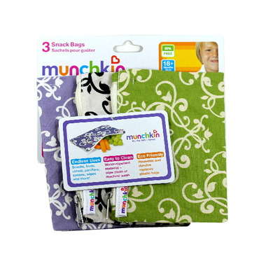 - 3 snack bags (green, purple, and white & black) included