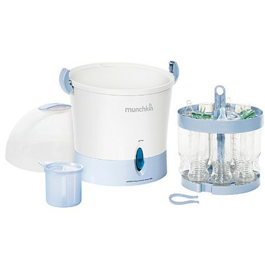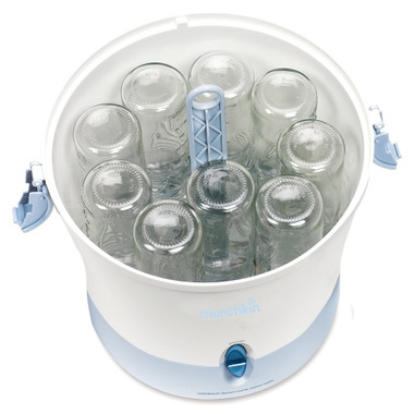 Protect your baby from harmful bacteria without harsh chemicals with the Steam Guard Electric Sterilizer by Munchkin. With the push of one button, you can safely disinfect bottles, pacifiers, small toys and more. The large capacity sterilizes up to 9 bottles and accessories at a time and features an adjustable tray to fit all sizes and clips bottles to keep them upright. Keeps fingers safe from heat with the heat resistant handle and tongs. The dome lid securely latches closed to trap hot steam. When sterilization is complete and the germs are gone, the sterilizer automatically shuts off.