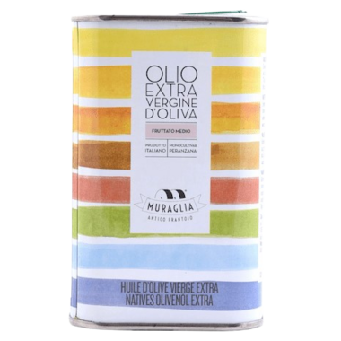 Muraglia Rainbow Tin Premium Extra Virgin Olive Oil Medium Fruity to be used to enrich and strengthen flavors of the dishes. A tin with vintage charm to give as a gift or for yourself.