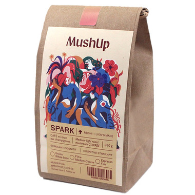 MushUp Spark is a medium-light roast mushroom coffee and cognitive stimulant.