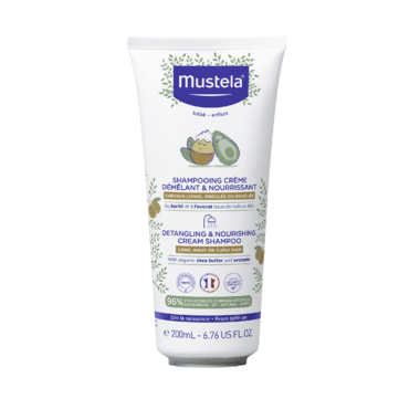 Detangling & Nourishing Cream Shampoo makes managing your child's textured hair easy and enjoyable. Ideal for wavy, curly, this gentle formula cleans, hydrates, and detangles, leaving hair soft, shiny, and bouncy without drying the scalp. Composed of 96% natural ingredients, including shea butter and avocado oil, it defines curls, reduces frizz, and provides deep hydration without weighing hair down. It leaves hair smooth, tangle-free, and lightly scented with Mustela’s iconic fragrance.