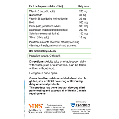 Ingredients: Each tablespoon contains: Natural liquid kelp extract with naturally occurring iodine as well as potassium iodide amounting to 300mcg, selenium (selenomethionine) 100mcg, ascorbic acid (non GMO) 200mg, silicon (silicic acid) 10mg, biotin 500mcg, magnesium (bisglycinate) 200mg, niacinamide 30mg, vitamin B6 (pyridoxine hydrochloride) 20mg