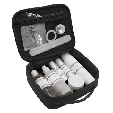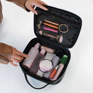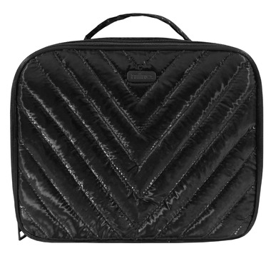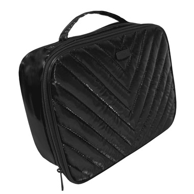 This stylish and structured cosmetic case features a sleek chevron quilted design and a convenient top handle ideal for organizing toiletries, cosmetics, or travel essentials.