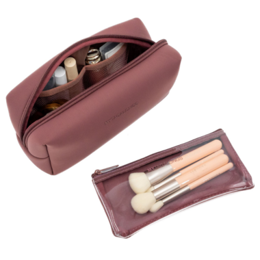 This pouch can fit not only your lipsticks, blushes, and pencils, but also your makeup tools, sponges and brushes. Features inner pockets and a clear brush pouch to keep it all organized and clean. Made of Premium Lycra Neoprene, this pouch is compact and lightweight, and fits anywhere.