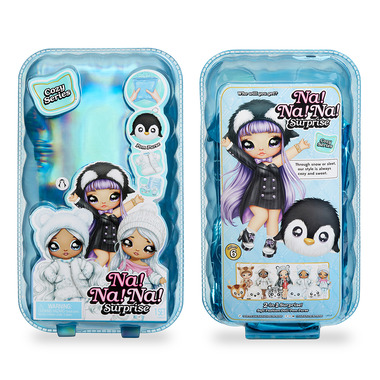 Through snow or sleet, our style is always cozy and sweet. Introducing the all new Na Na Na Surprise Cozy Series 2-in-1 soft fashion dolls! You get 2-in-1 value with a soft, posable fashion doll plus a collectible clip-on fuzzy fabric animal pom purse! The cozy series dolls feature winter-inspired animal fashions, printed face and clothing details and matching fuzzy beanie. Meet Isla Waddles! She has beautiful purple hair, printed face and clothing details and gorgeous fashions. Her outfit is inspired by a penguin. She is dressed in a black pinstripe suit dress with colored satin lining and molded buttons, satin ribbon bowtie with matching fuzzy penguin-inspired beanie and laced heels. Featured in blind packaging, the doll remains a mystery until revealed through the exciting confetti balloon experience. Open the package to find a foil balloon bag inside. Insert included straw (taped on inside of package) into balloon halfway into the tab on the bottom of the balloon, blow into the straw to inflate the balloon (do not over-inflate), gently peel off perforated strip on top of the sticker on the balloon, then gently squeeze the balloon for confetti surprise! Tear open the bag to reveal which doll you got! Six styles to collect!