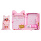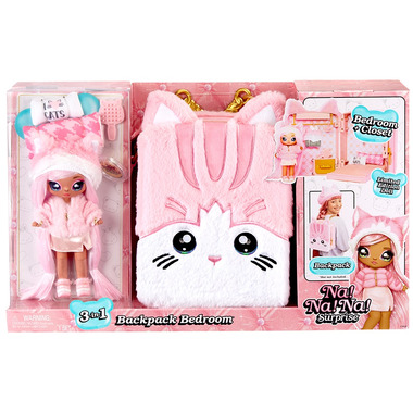 Unbox the most fashionable playset for your dolls with the Na! Na! Na! Surprise Backpack Bedroom. This adorable, soft playset is 3-in-1 – a stylish, pink kitty backpack, adorable bedroom playset with closet and soft articulated fashion doll, Reena De La Rosa. The gorgeous backpack is soft and fuzzy, and has a personality that totally matches Reena's catitude. Open it up to reveal a bedroom playset with fold-out bed, closet with working drawer, pillows, blanket and hangers, all with cute, kitty details. Reena has gorgeous, long hair, a fuzzy hat, and she comes wearing an exclusive outfit and shoes. When finished playing, pack everything up and take the backpack one-the-go. Two styles to collect.