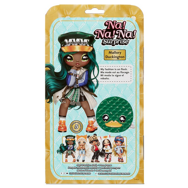 Level up your glam game with the all new Na Na Na Surprise 2-in-1 Soft Fashion Doll Glam Series 2! You get 2-in-1 value with a soft fashion doll plus a collectible clip-on metallic fabric animal pom purse! The glam series features eye-catching metallic fabrics in the animal-inspired doll fashions and purse which has a convenient cute, animal-shaped clip to attach to a backpack or larger purse. Na Na Na Surprise dolls are the first-ever soft, posable fashion dolls with printed face and fashion details. Now featured in open packaging to show off all the quality details, it will be easier than ever to collect them all! Mallory Duckington comes with a tag with her name, birthday and a little about her. The Glam Series 2 includes 5 adorable soft fashion dolls in trendy fashions to collect.