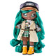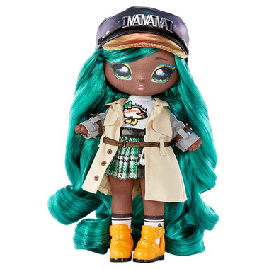 - IT'S ALL IN THE DETAILS: Mallory has beautiful long and wavy greenish-blue hair. She comes with printed face and clothing details and gorgeous fashions. She is dressed up in a multicolor trenchcoat with belt, cropped t-shirt with duck screenprint, plaid woven skirt with molded safety pin charm, leather close-toe sandals and cap with sculpted silver ""NANANA"" letters and gold brim.