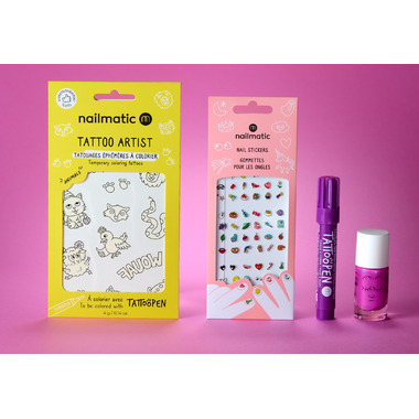 Specially designed for budding artists who like to express their style with creativity and originality! Marshi Water-Based Nail Polish + Magicnails Nailstickers + Purple Tattoo Pen + Animals Temporary Tattoos.
