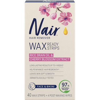Nair Wax Ready Strips are our fastest, easiest wax strips ever with no warming or rubbing required**. Their rich formula is specially designed for your face and bikini area. It uses the nourishing power of 100 percent naturally sourced rice bran oil to rejuvenate and moisturize, leaving you with glowing, hair-free skin. Nair Wax Ready Strips are an easy-to-use, affordable and mess-free solution to removing unwanted hair. Without any messy residue to clean up, your gorgeously smooth skin is ready to show off in minutes.
