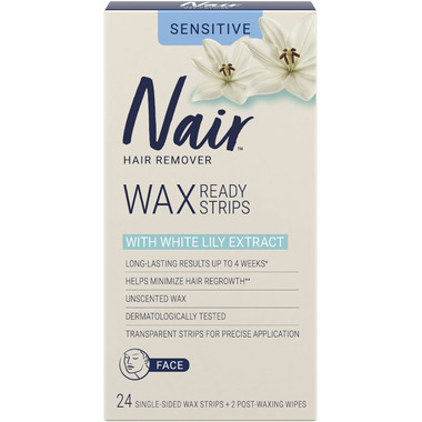 Nair Wax Ready Strips are our fastest, easiest wax strips ever with no warming or rubbing required**. Their rich formula is specially designed for hair on your face. It uses the nourishing power of soothing white lily to rejuvenate and moisturize, leaving you with glowing, hair-free skin. Nair Wax Ready Strips are an easy-to-use, affordable and mess-free solution to removing unwanted hair. Without any messy residue to clean up, your gorgeously smooth skin is ready to show off in minutes.